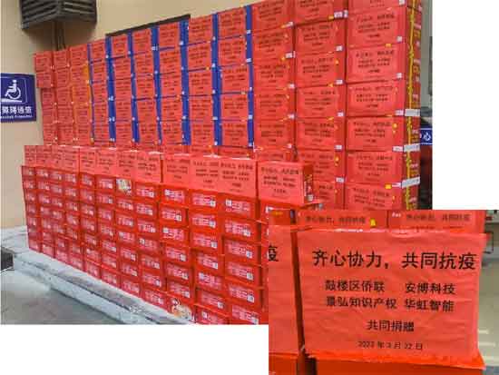 3月22日下午,在鼓樓區(qū)僑聯(lián)的帶領(lǐng)下,華虹智能與安博科技、景弘知識(shí)產(chǎn)權(quán)一起,向五鳳街道的一線工作人員,捐獻(xiàn)了方便面、八寶粥共計(jì)260箱。希望通過(guò)實(shí)際行動(dòng),共同筑牢疫情防線,為打贏疫情防控阻擊戰(zhàn)貢獻(xiàn)一點(diǎn)綿薄之力。