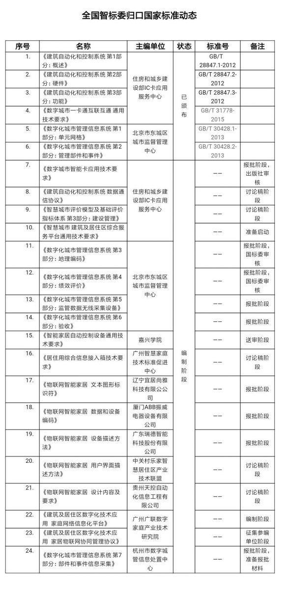 全國(guó)智能建筑及居住區(qū)數(shù)字化標(biāo)準(zhǔn)化技術(shù)委員會(huì)(SAC/TC426)(簡(jiǎn)稱“全國(guó)智標(biāo)委”)。全國(guó)智標(biāo)委于2008年由國(guó)家標(biāo)準(zhǔn)化管理委員會(huì)批準(zhǔn)(國(guó)標(biāo)委綜合[2008]108號(hào))成立,由住房和城鄉(xiāng)建設(shè)部負(fù)責(zé)業(yè)務(wù)指導(dǎo)的技術(shù)標(biāo)準(zhǔn)組織。全國(guó)智標(biāo)委作為城市建設(shè)領(lǐng)域信息化產(chǎn)品標(biāo)準(zhǔn)國(guó)內(nèi)唯一歸口單位,主要負(fù)責(zé)智能建筑物數(shù)字化系統(tǒng)領(lǐng)域國(guó)家標(biāo)準(zhǔn)的制修訂工作,其工作領(lǐng)域與國(guó)際標(biāo)準(zhǔn)化組織建筑物環(huán)境設(shè)計(jì)技術(shù)委員會(huì)建筑物控制系統(tǒng)設(shè)計(jì)工作組(ISO/TC205/WG3)相關(guān)聯(lián)。主要圍繞智慧城市、智慧社區(qū)、數(shù)字城管、智能家居等方面開(kāi)展關(guān)鍵技術(shù)標(biāo)準(zhǔn)研究、歸口管理及應(yīng)用示范推廣工作。