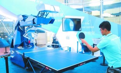 一名工作人員在2018世界人工智能大會上演示與機器人打乒乓球。