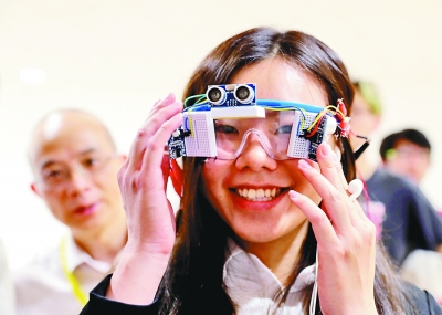 上海交大學生在展示為視障人士研發的具有導盲功能的眼鏡控制系統。